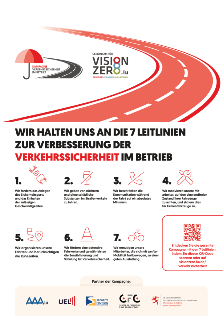 Da der Schutz der Mitarbeiter schon lange vor der Ankunft am Arbeitsplatz beginnt, fordert die Kampagne „Verkehrssicherheit im Betrieb” Arbeitgeber und Arbeitnehmer, sowie Sicherheitsbeauftragte auf, dauerhaft die richtigen Reflexe zu entwickeln, um die Risiken im Zusammenhang mit Dienst- und Pendlerfahrten zu verringern.